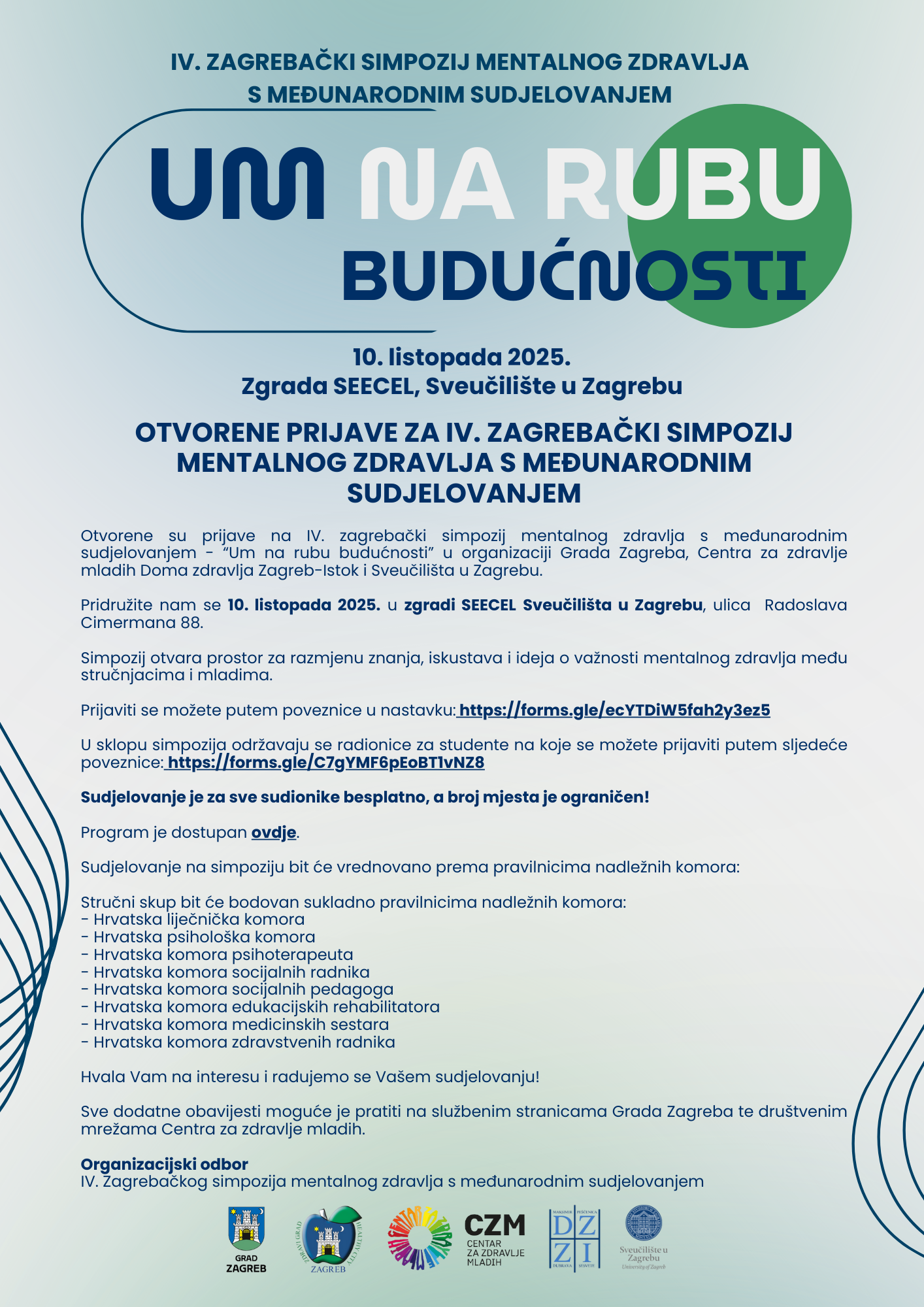 Grad Zagreb, Centar za zdravlje mladih Doma zdravlja Zagreb – Istok i Sveučilište u Zagrebu organiziraju IV. Zagrebački simpozij mentalnog zdravlja s međunarodnim sudjelovanjem „Um na rubu budućnosti”.